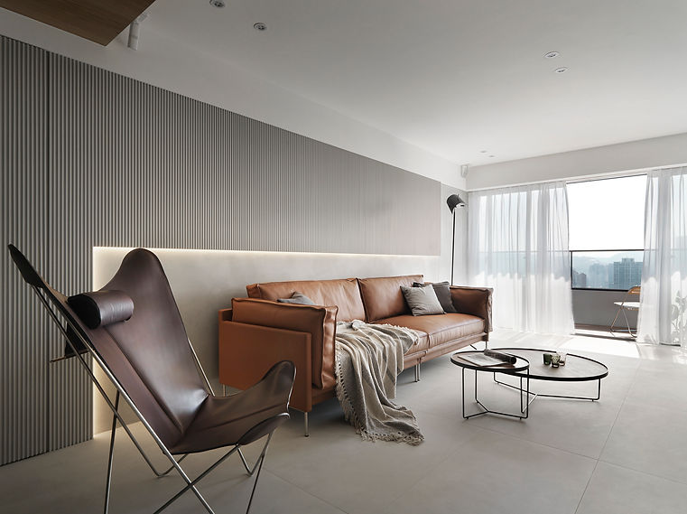 將景色留在我們之間,於這個空間裡,壁面大量使用淺灰色藝術漆,與落地窗引入的自然光景交織,